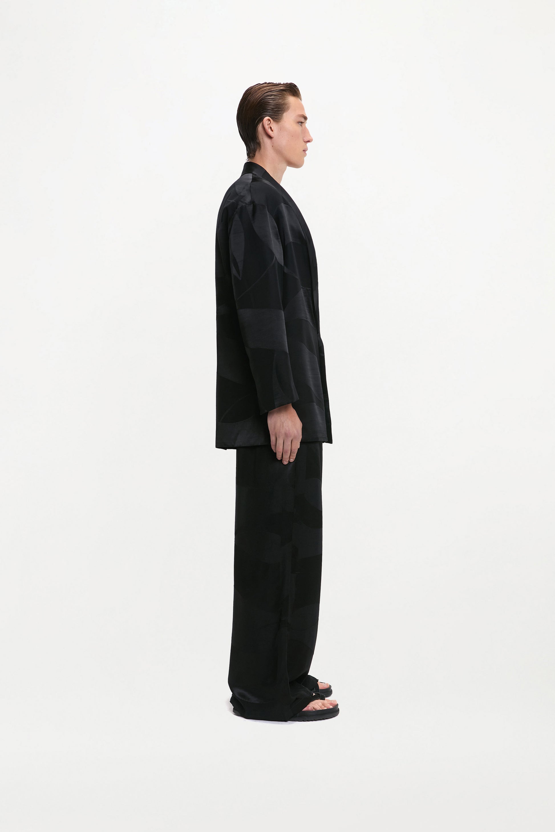 A confident cut in a signature fabric. The Clement Trousers are wide-leg and tailored in Delos’ monogram jacquard - a subtle, light-catching weave developed to bring quiet texture to clean silhouettes. Designed to move effortlessly between settings.