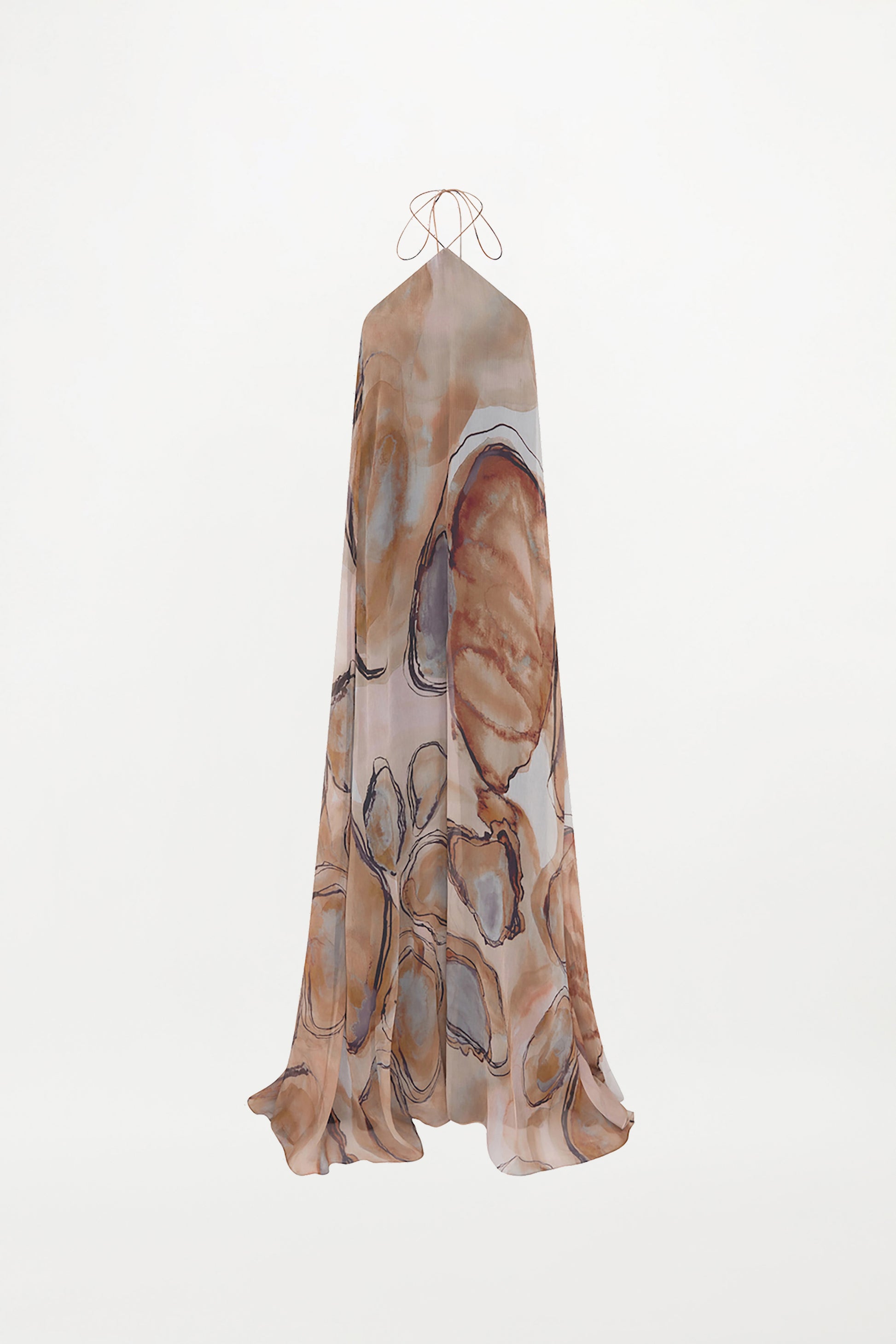 Sheer crinkle silk georgette in glowing bronze, scattered with shell motifs inspired by shifting tides. A slim halter tie gathers at a single point before plunging to a rounded, backless cut. The airy skirt falls in generous volume, so can be sized down...