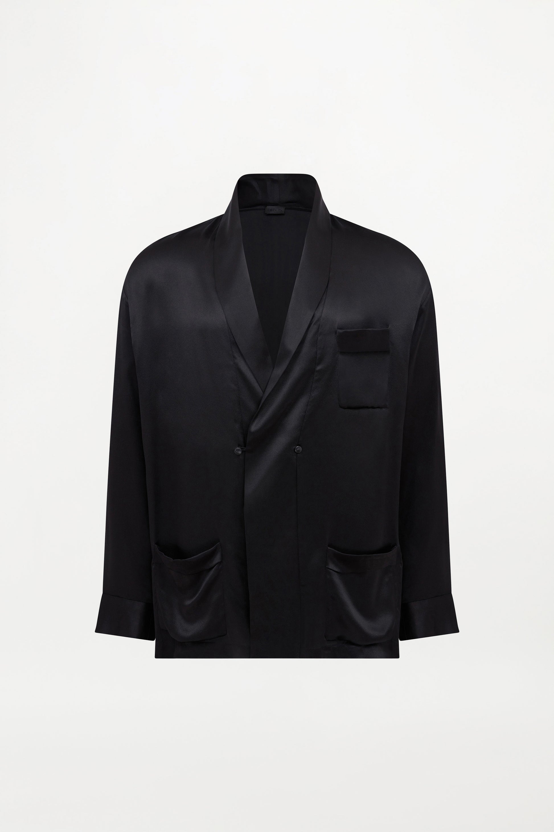 Cut from fluid black silk satin, the Gilbert jacket is a study in controlled softness. A shawl collar and crossover front fasten cleanly with minimalist, sustainable buttons, while the long sleeves and relaxed cut invite movement. Understated yet directional, it shifts between structure and ease...