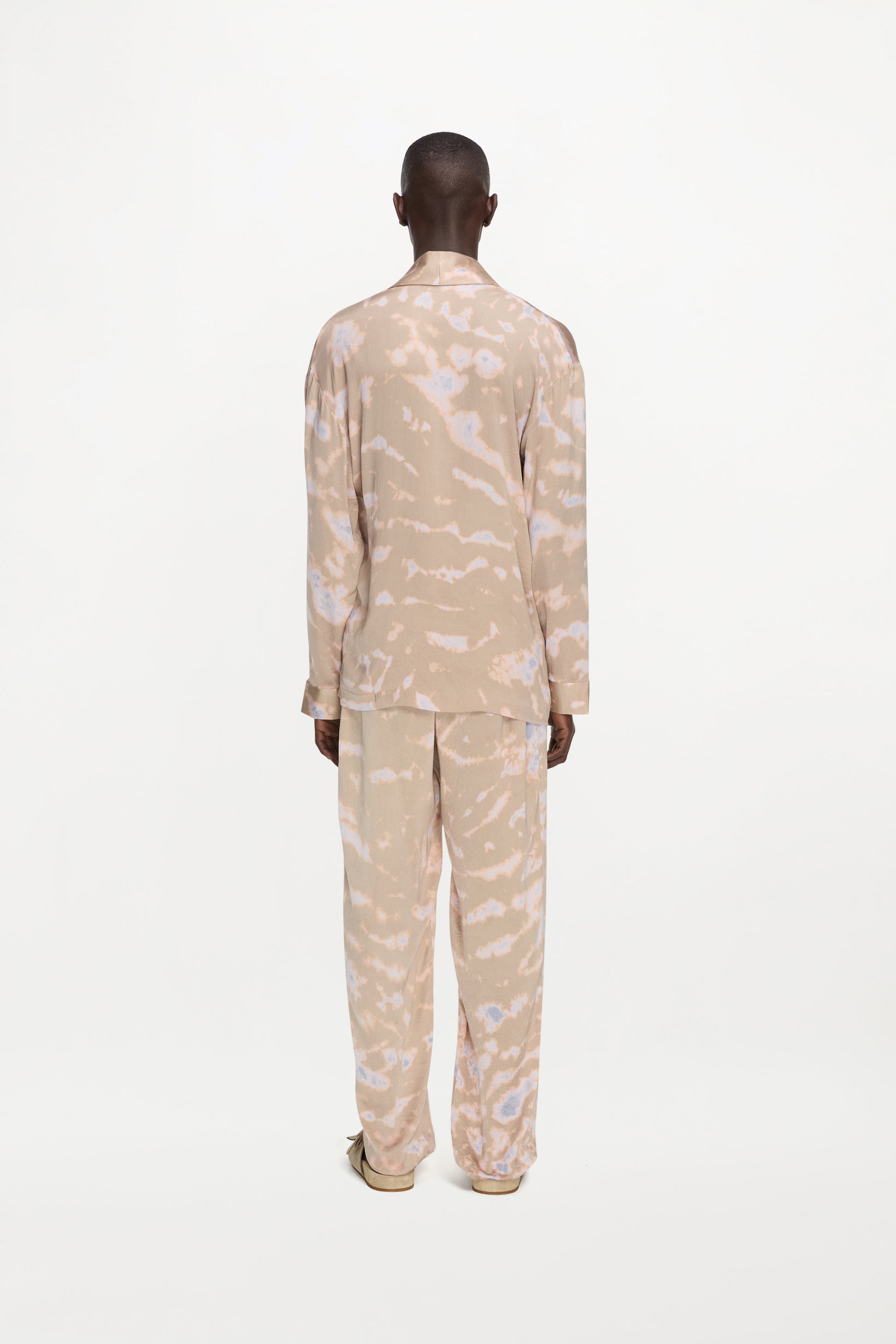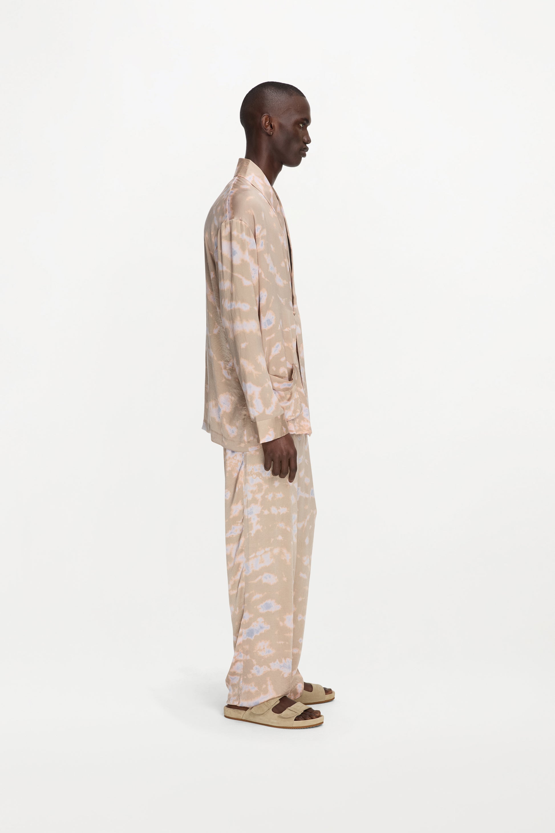 Crafted in lustrous silk satin awash with lava-nude and soft lavender tones, the Gilbert jacket is fluid by design. A curved shawl collar and clean crossover front trace an unforced silhouette, buttoned with quiet precision. Long sleeves lend structure to the ease. Worn true...