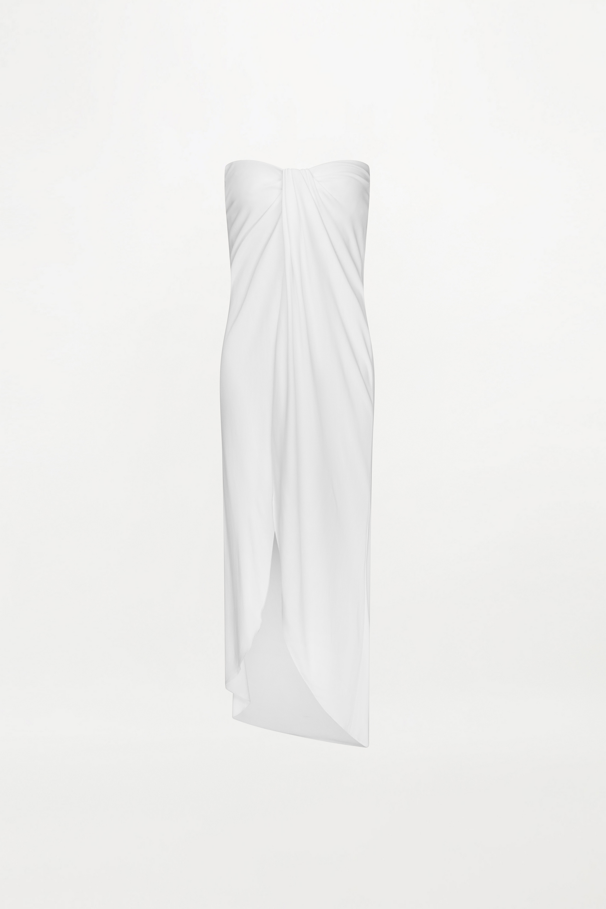 The Leda Dress is cut in soft white jersey with a clean neckline. It drapes close to the body, combining comfort with quiet sophistication.