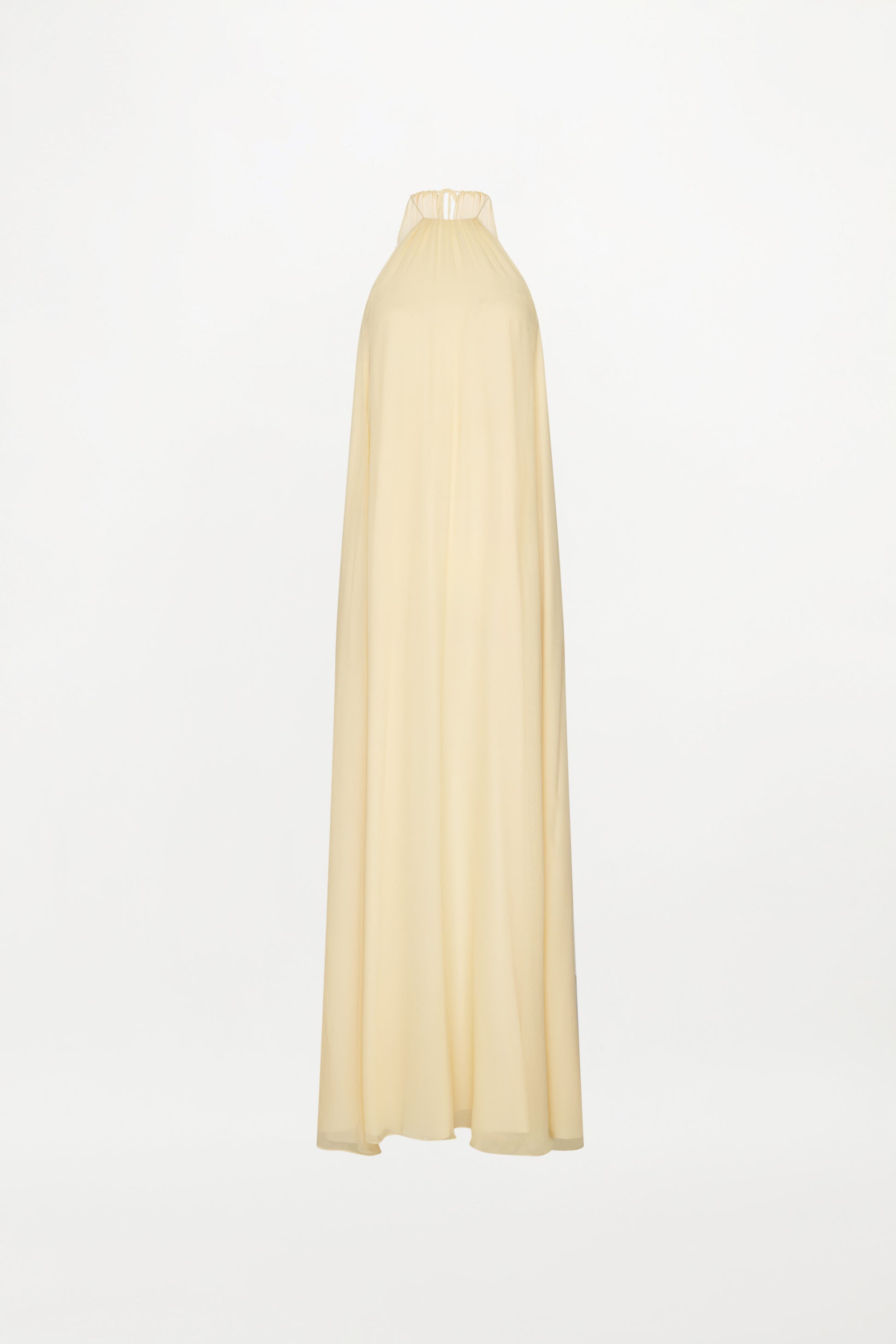 Cut in textured crinkle georgette with a soft A-line shape, the Luna Dress is fully lined and built to move. Exposed shoulders and a high neckline keep it simple and fresh.