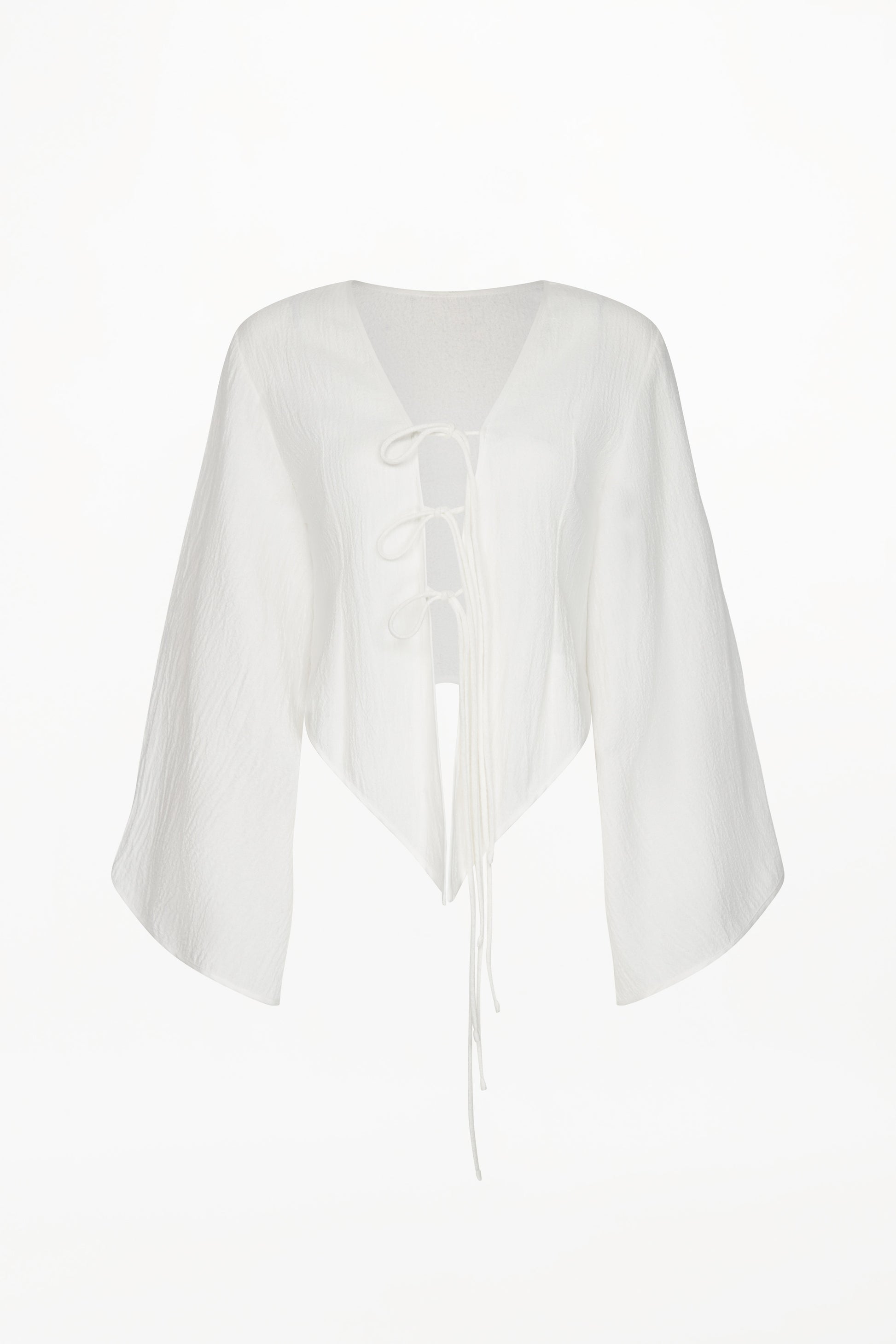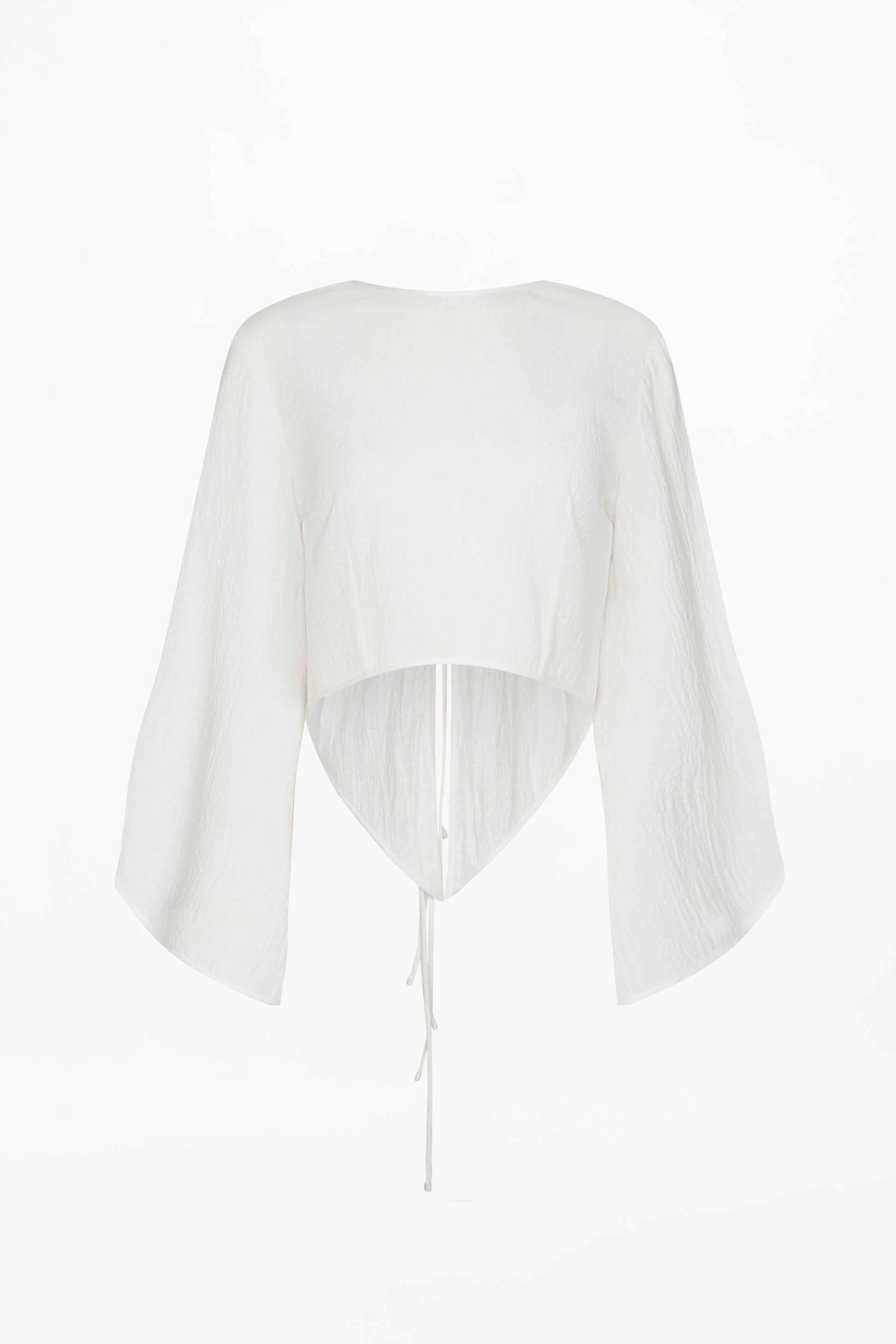 A clean neckline, sculptural sleeves, and a lace-up back define the Nailah Top. Cut from crisp white cotton, it’s refined but relaxed - a new shape for warm days.