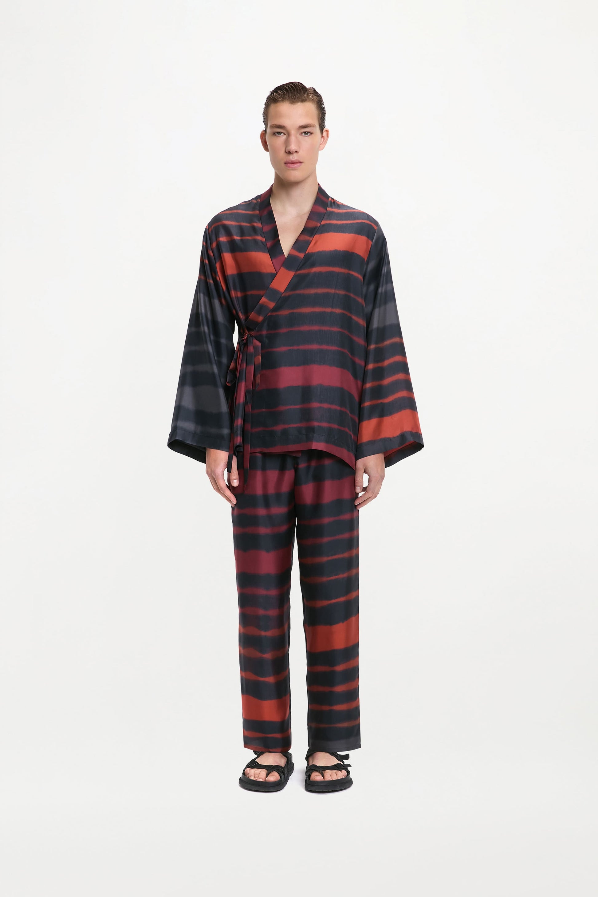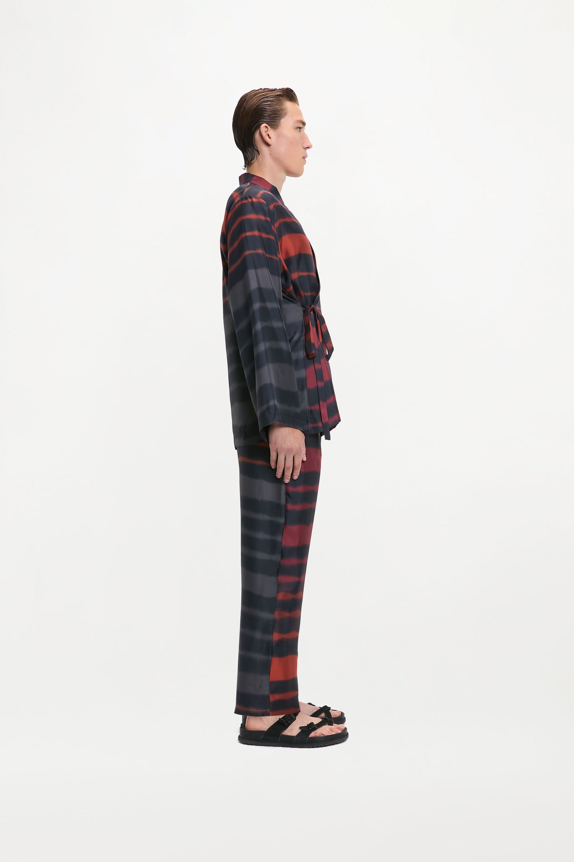 Rainbow Croc silk satin recall sun‑soaked hues, giving the Tao jacket a luminous, coastal spirit. Cut in a relaxed kimono shape with a soft shawl collar and long sleeves, it drapes effortlessly. An elevated layer that moves from unhurried mornings to dusky evenings...